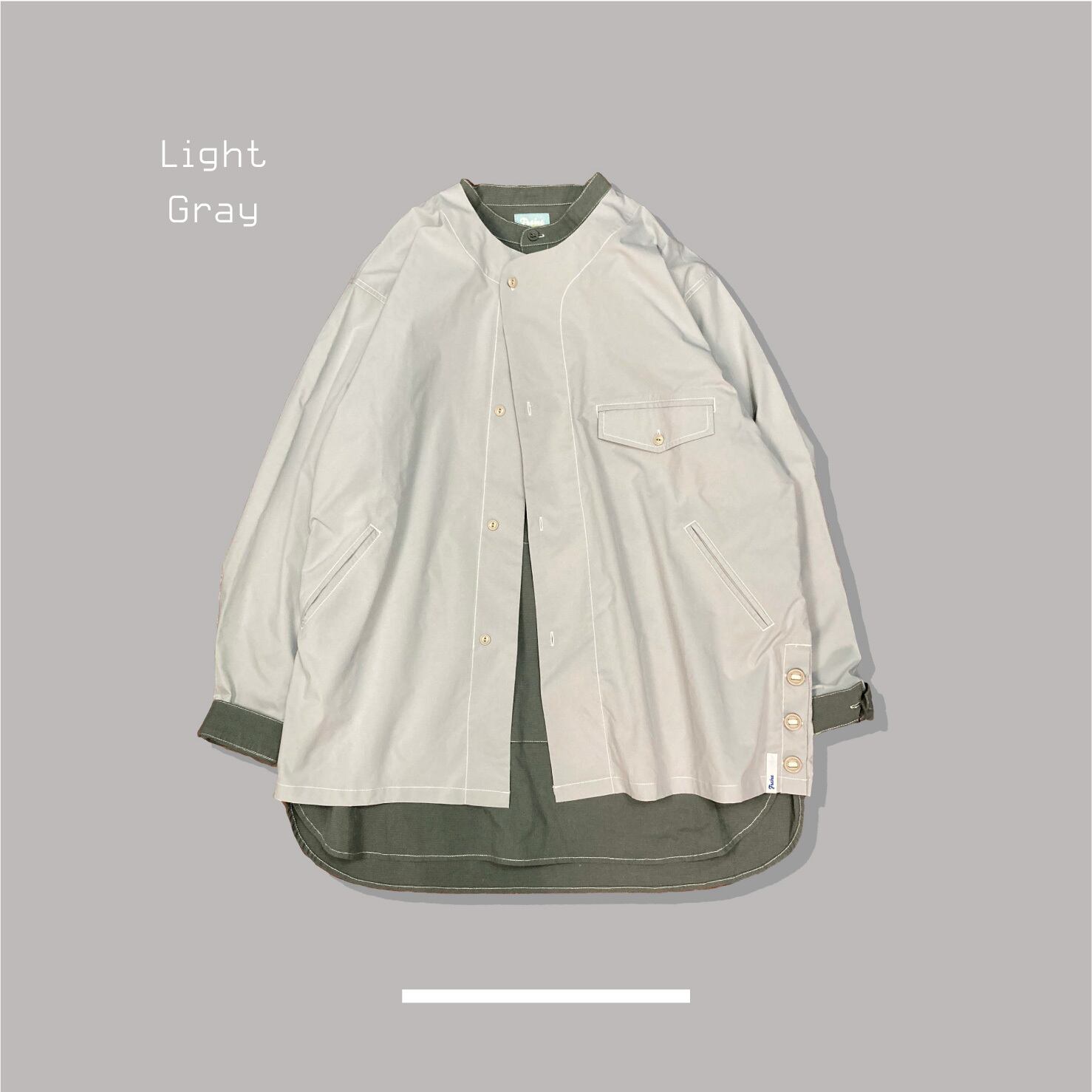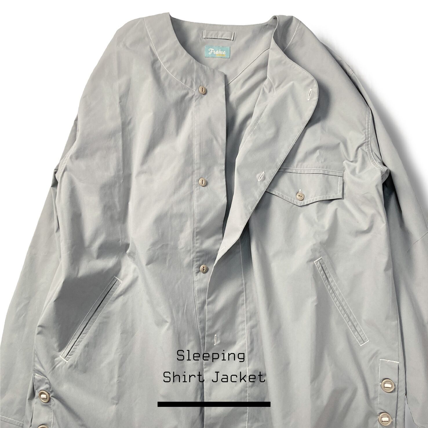 SミリタリーのスリーピングシャツをFrameのフィルターを通して構築した、ノーカラーのシャツジャケット。