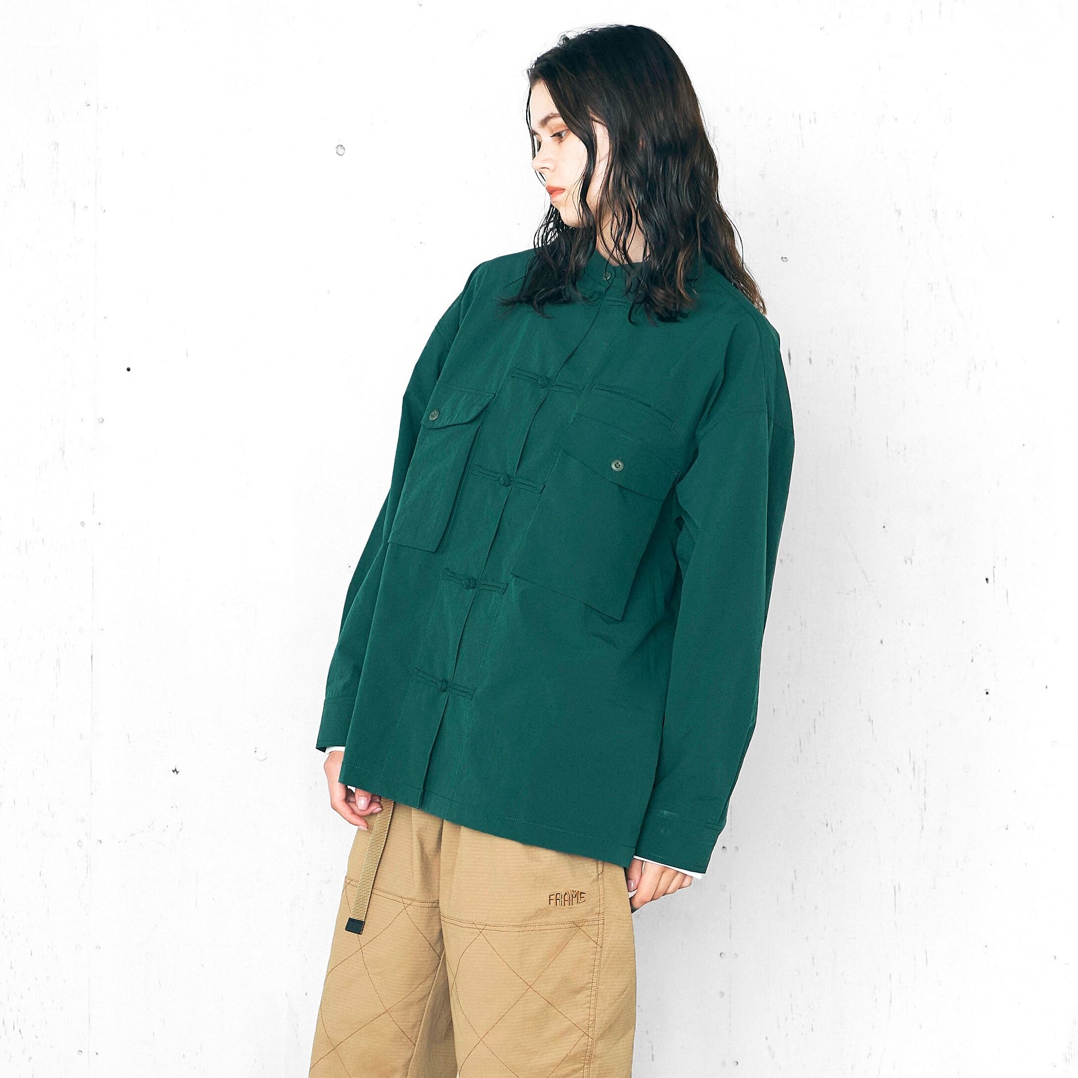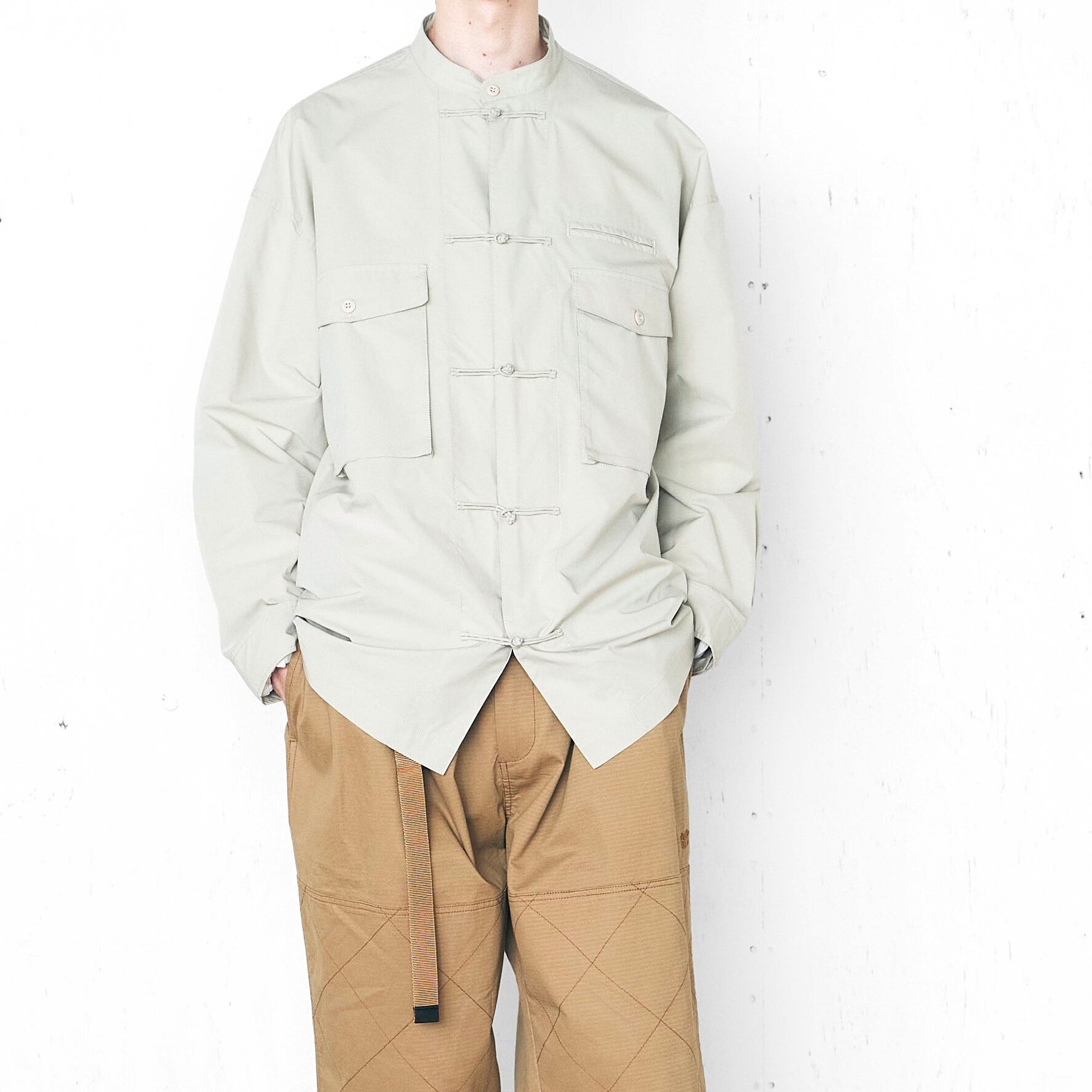 ゆったりとしたシルエットのカンフーシャツ。