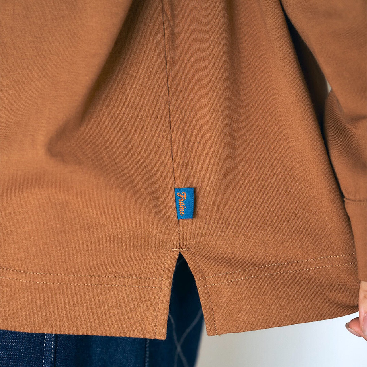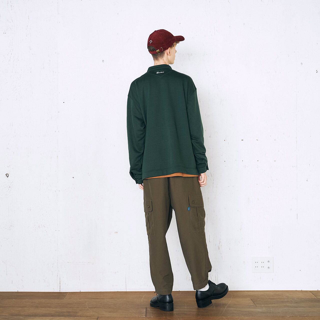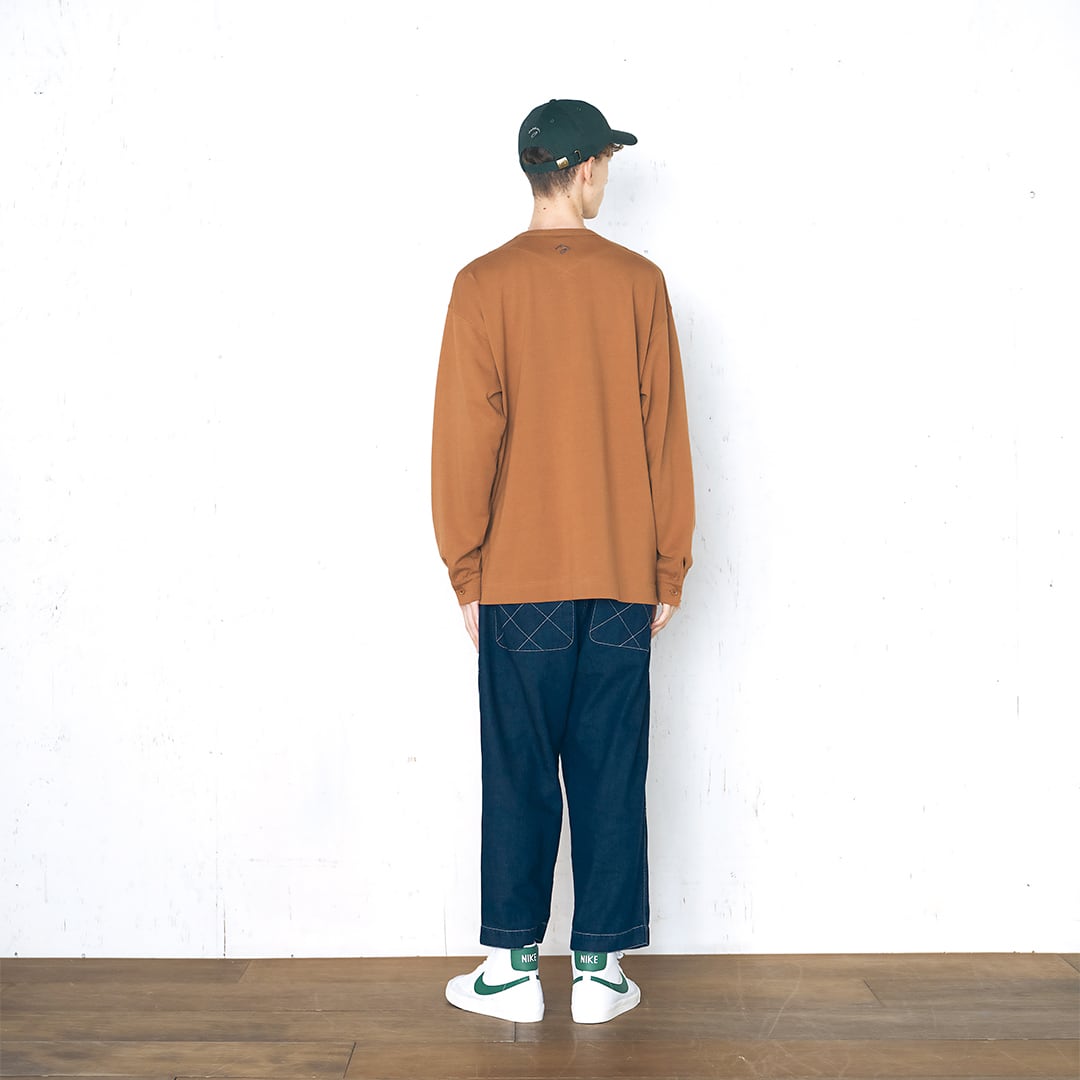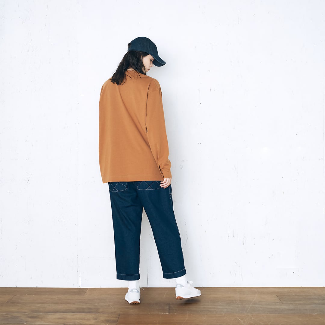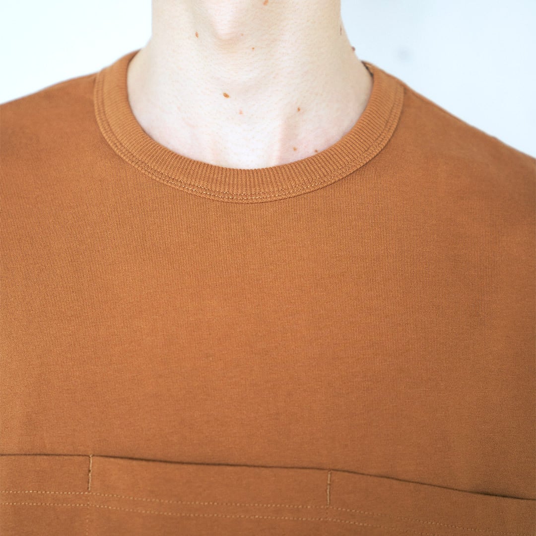 ミドルオンスの生地で耐久性があるボディに衿ぐりの見返し仕様、袖口はシャツ袖のディティールを採用。